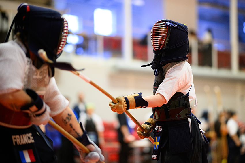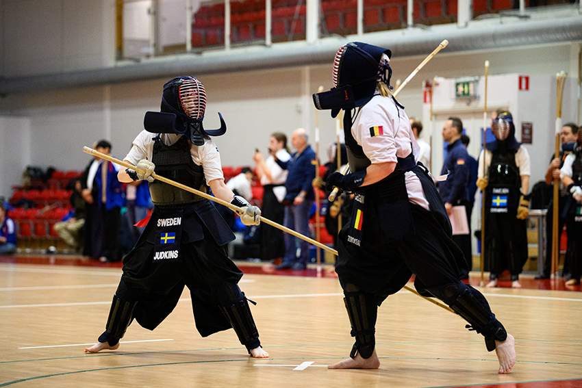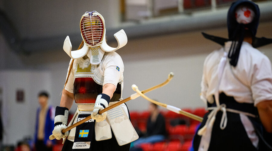 Sveriges Sophia Judkins tävlar i lag-shiai under EM i Naginata den 26 oktober 2025 i Uppsala.