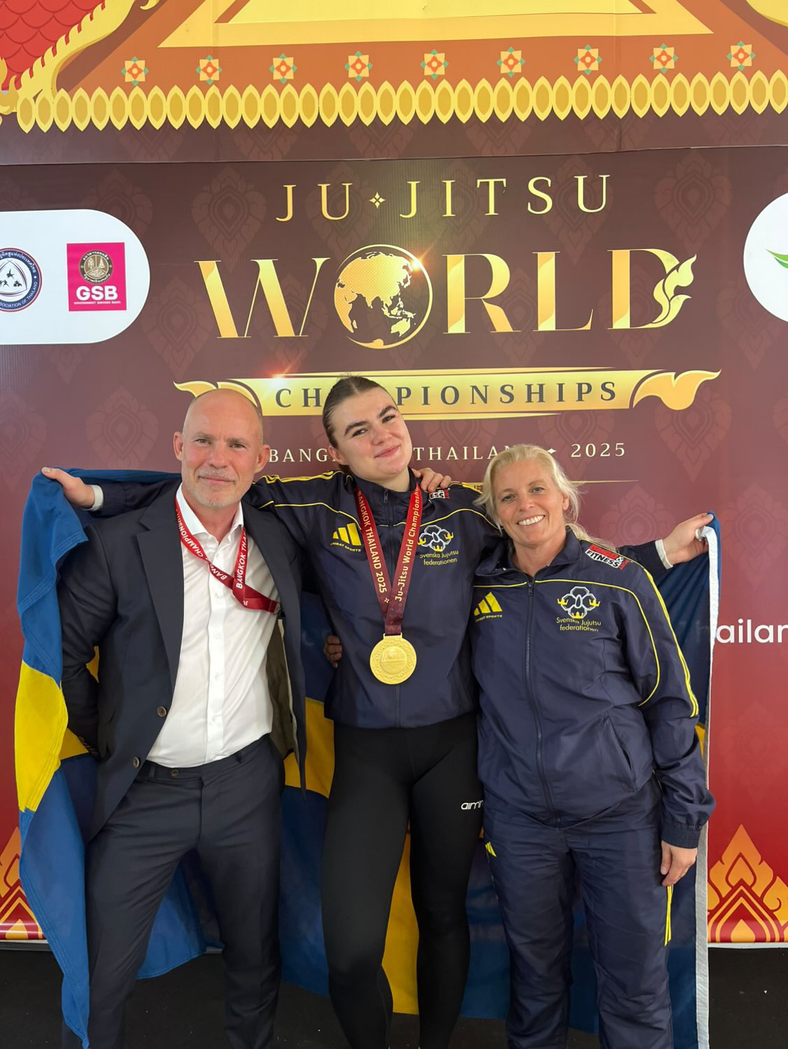 Bild från VM i Bangkok 2025 som föreställer Joakim Vistam, Emma Lette och Linda Lindström.