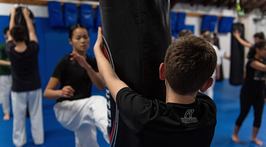 Fotot: Deltagare slår på en säck under en ungdomsträning med Banzai Karate Kai den 23 november 2020 i Göteborg.